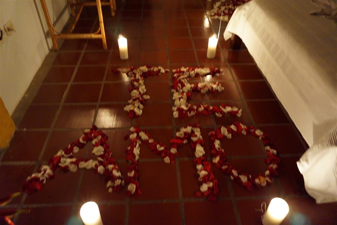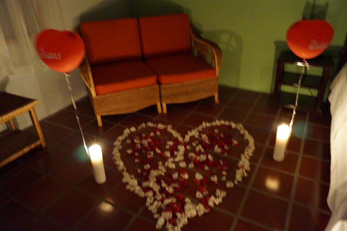 ♥ Arreglo floral y decoración en la habitación con petalos, velas y globos de helio.